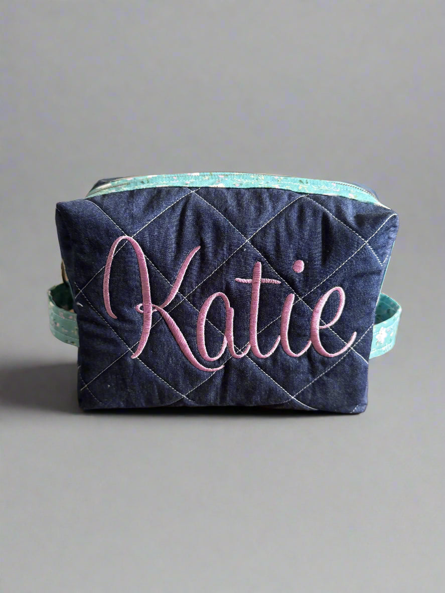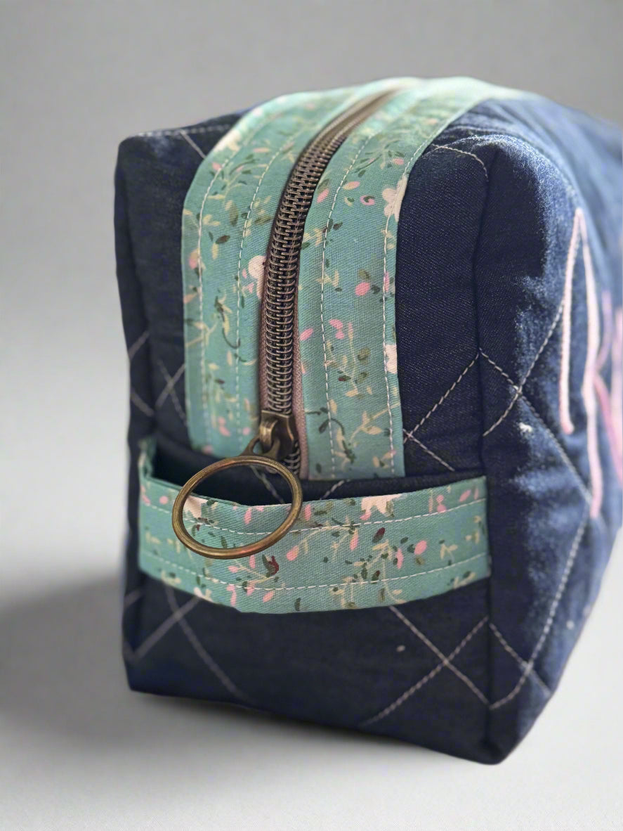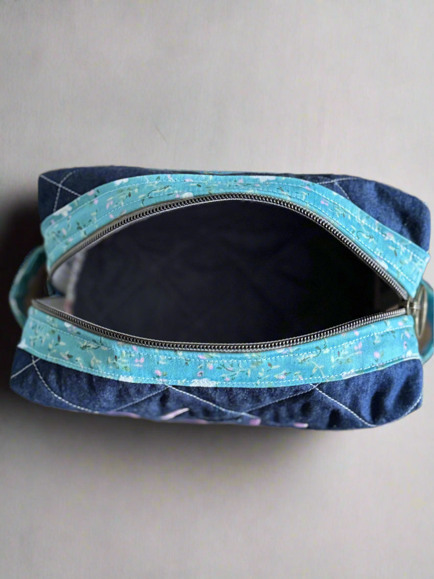 This denim cosmetic bag offers ample space for makeup, travel necessities, or small creative supplies.