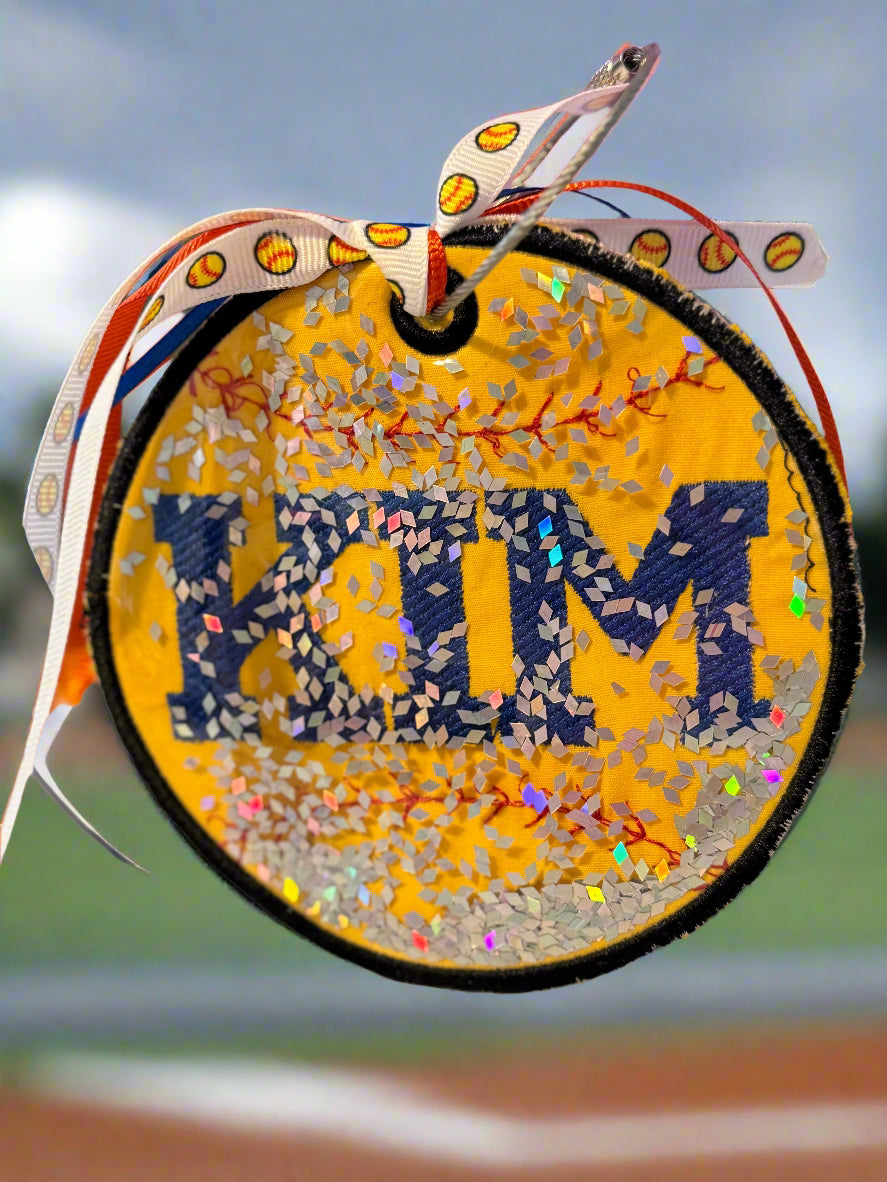 Available in softball or volleyball designs, each tag can be personalized with your name and jersey number, and finished with a burst of glitter that shines from every angle.